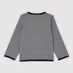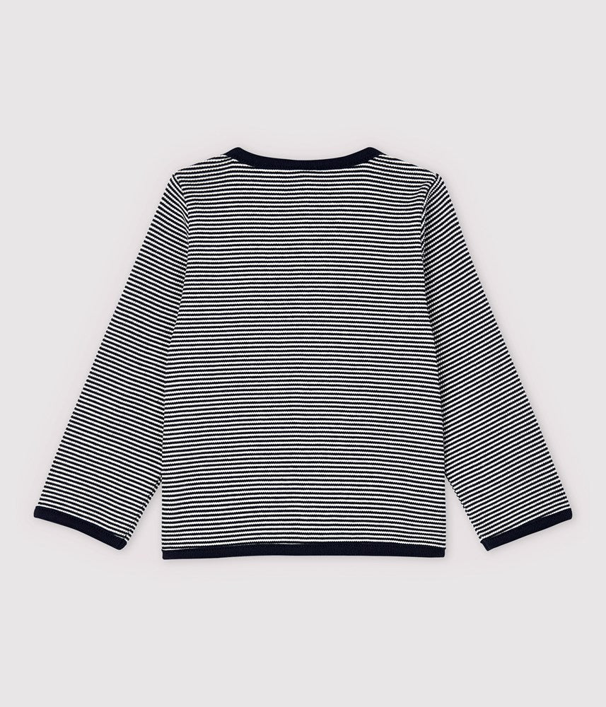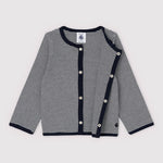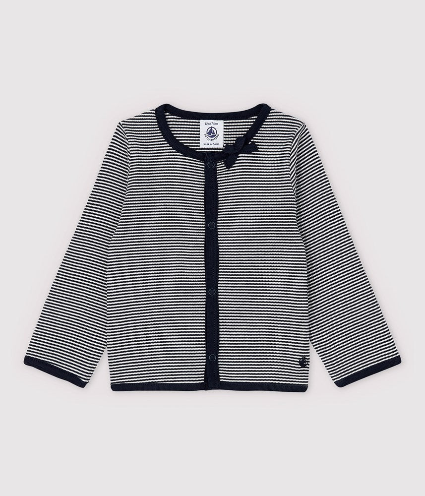 PETIT BATEAU HAS USED PINSTRIPES TO KNIT THIS PRETTY 2X2 RIB KNIT CARDIGAN.