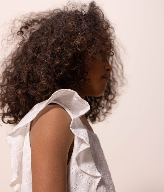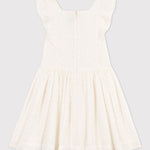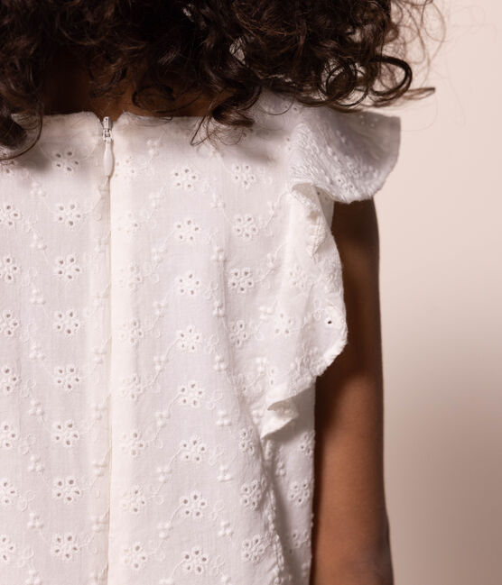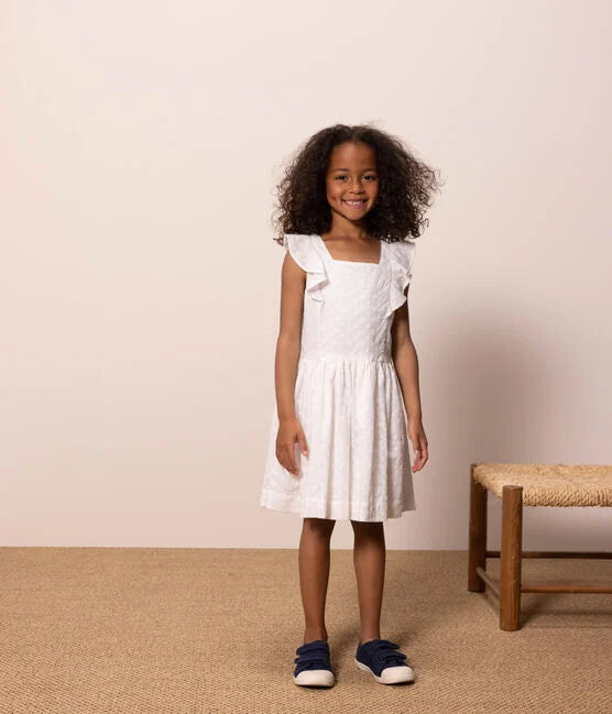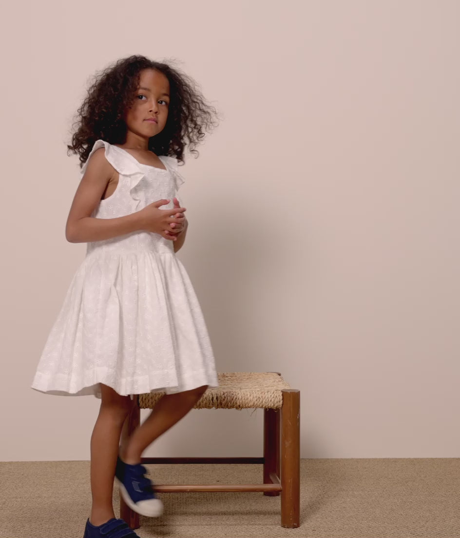 • Feminine and elegant dress with its pretty eyelet embroidery, its ruffled sleeves, its concealed zip and its flounced skirt.